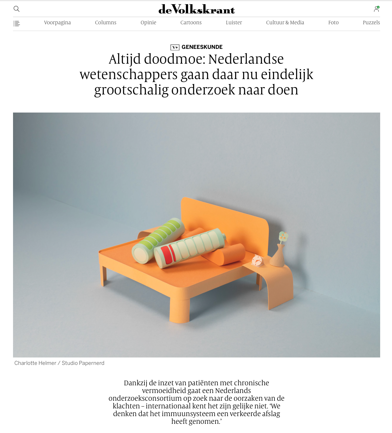 Recently, my 3D paper illustration was featured in De Volkskrant, accompanying the article Always Exhausted — an in-depth piece about the start of a large-scale study into ME/CFS and the creation of a biobank.