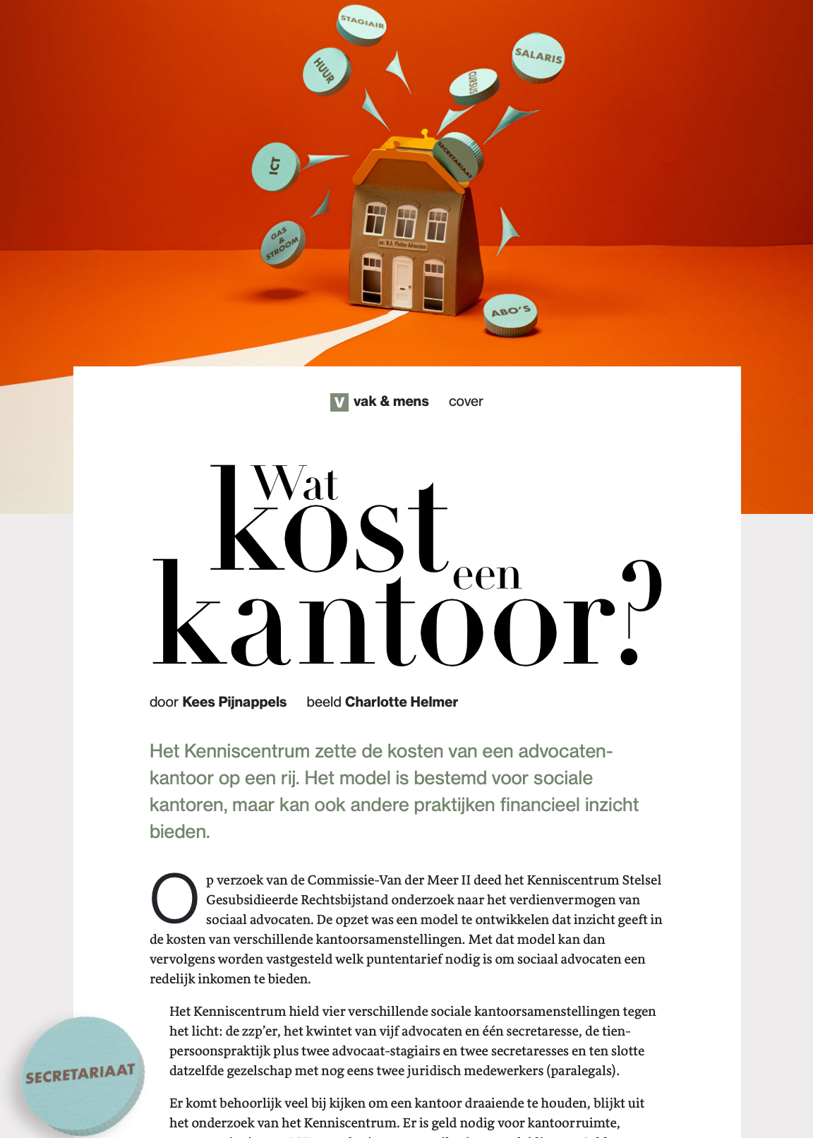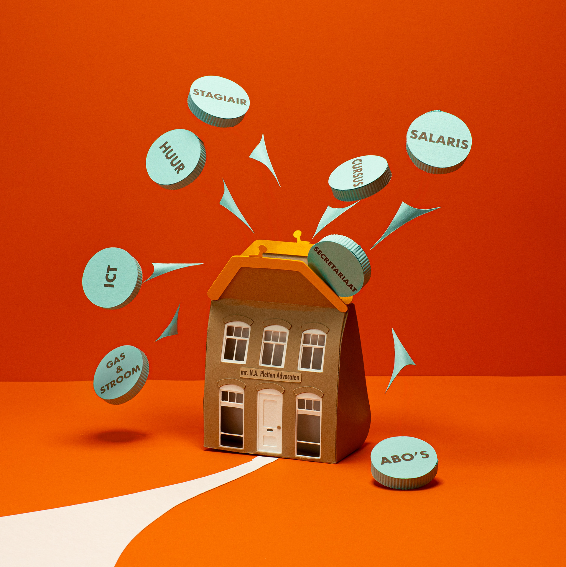 Wat een fijne opdracht. Geldzaken verbeelden kan soms wat saai zijn, maar dit keer juist helemaal niet. Het idee van geld dat uit je portemonnee vliegt - daar kon ik wel wat mee. Hoe leuk om dat bijna letterlijk te maken. Met papieren huisjes en het puzzeltje hoe transformeer je een kantoorpand in een portemonnee? werd het een illustratie waar ik met veel plezier aan heb gewerkt. Voor de cover van het Advocatenblad maakte ik een handgemaakte papierillustratie over de kosten van een advocatenkantoor.